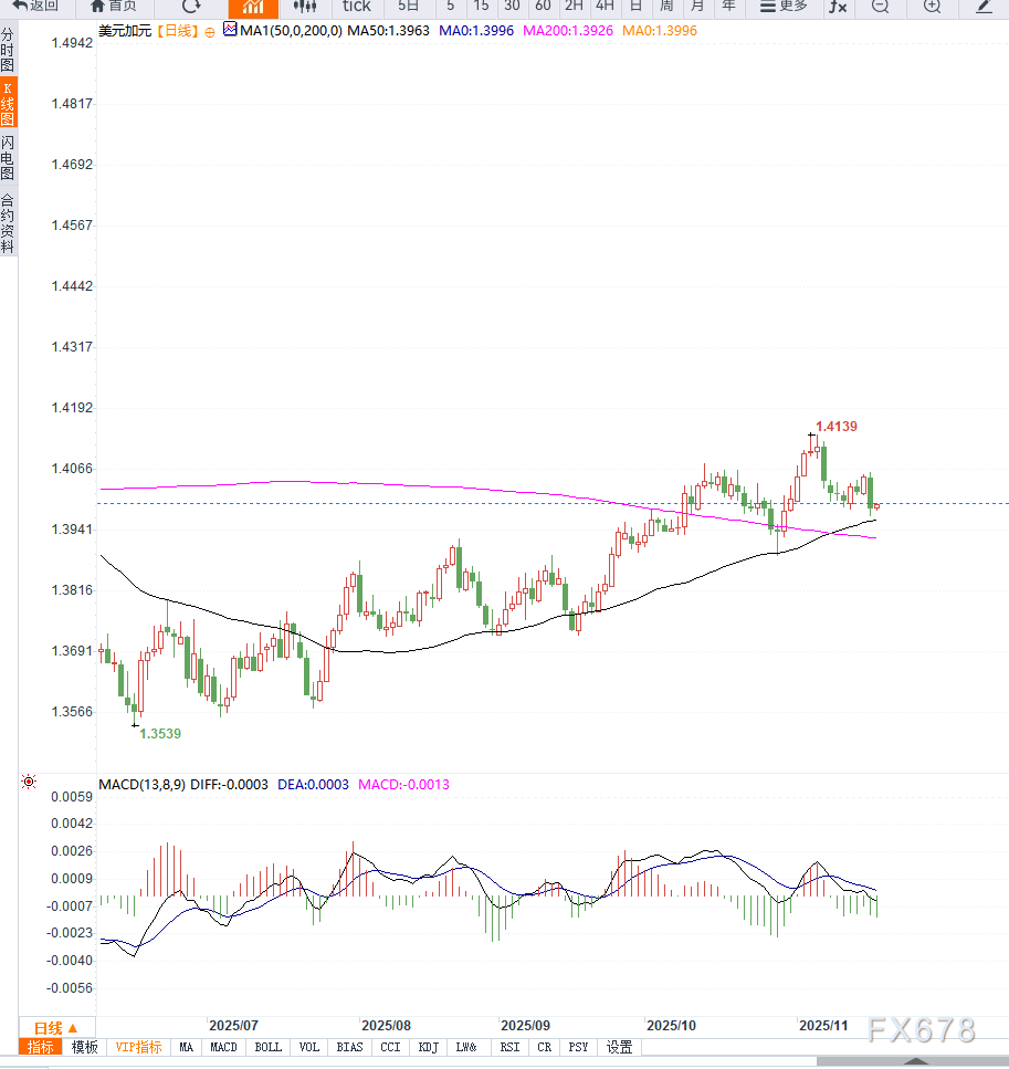 目前 USD/CAD 的多空力量主要由原油基本面恶化 + 北美政策差异共同驱动。油价疲弱短期持续压制加元,而加拿大内部通胀韧性为加元提供有限底部支撑,使汇价暂呈“震荡偏强”结构。若美国降息预期继续下调,该货币对的上行空间仍可能被打开。