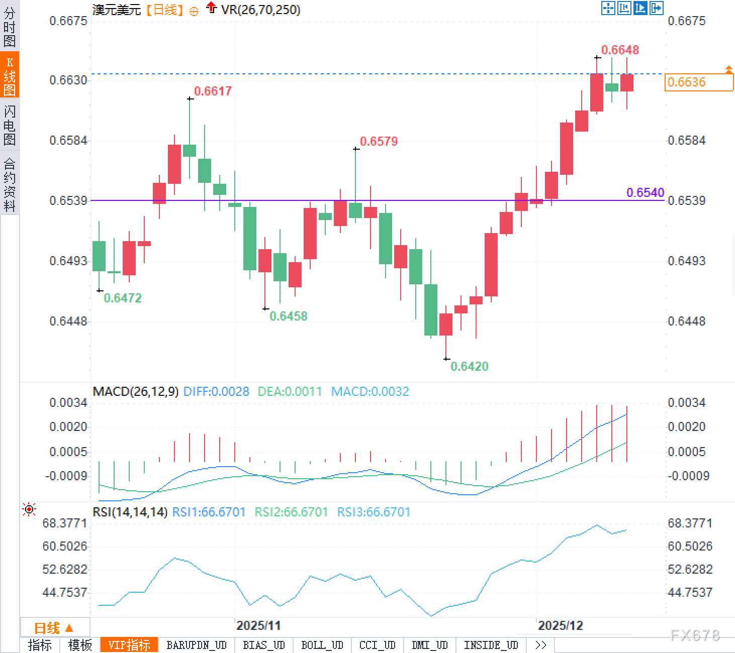 从日线结构看,澳元兑美元近期自0.6420一带低点抬升,形成更高的低点与更高的高点,短期上行节奏较为连贯,现价已逼近前高密集区。0.6648附近为近段时间的显著波峰,构成短线压力带;下方0.6540一线为图示关键水平,兼具前期整理区与回撤参照意义。指标方面,MACD处于零轴上方,DIFF与DEA呈多头排列,柱体放大显示动能仍偏强,但斜率变化需留意;RSI约66附近,处于相对强势区,尚未极端化,提示上行动能占优但短线也可能出现高位波动。整体而言,日线偏强修复格局延续,上方压力与动能边际变化将共同影响后续节奏。