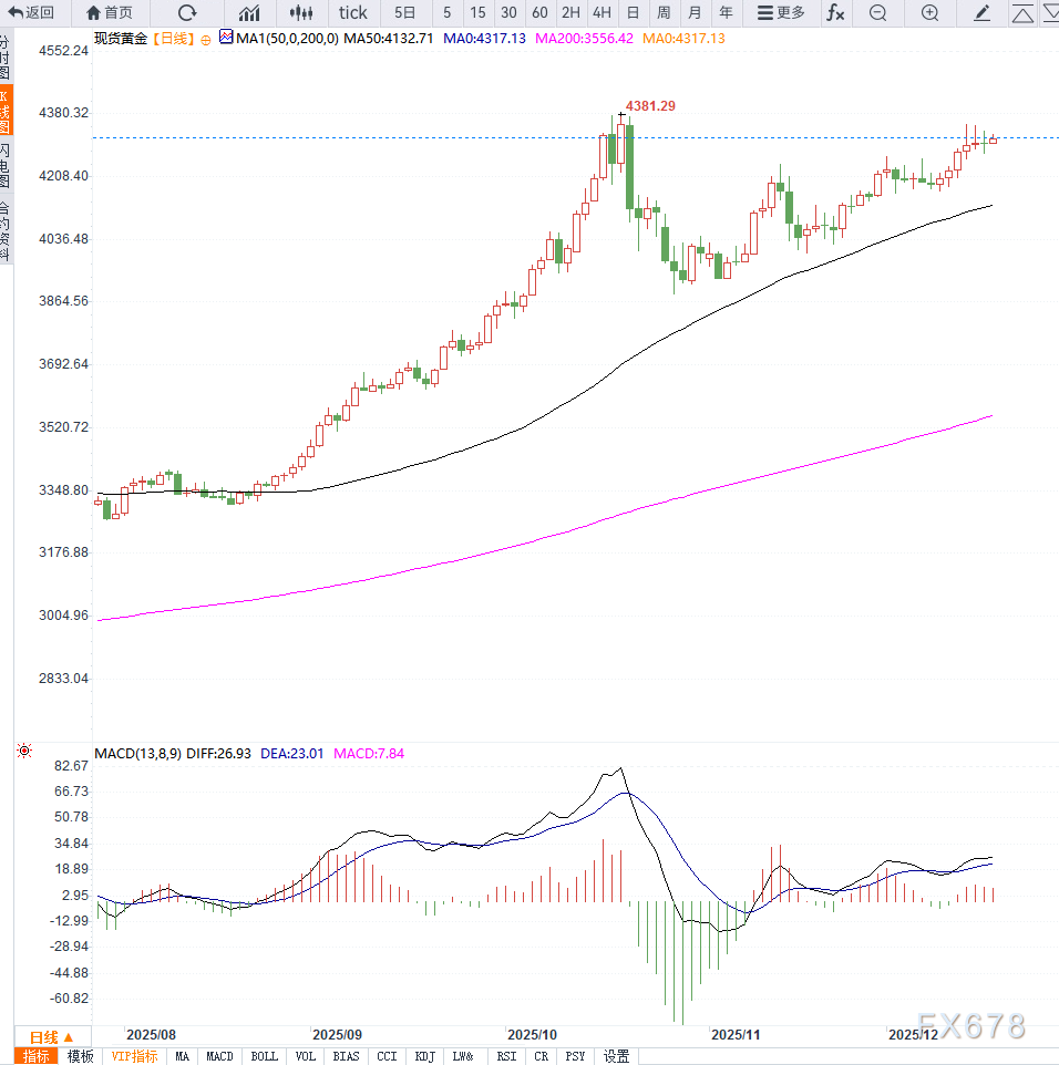 在日线图上,黄金稳居关键均线之上,RSI位于50上方,动能偏多。上方阻力位在4350美元(12月15日高点)和历史高位4381美元,下方支撑位分别是4270美元和4230美元。